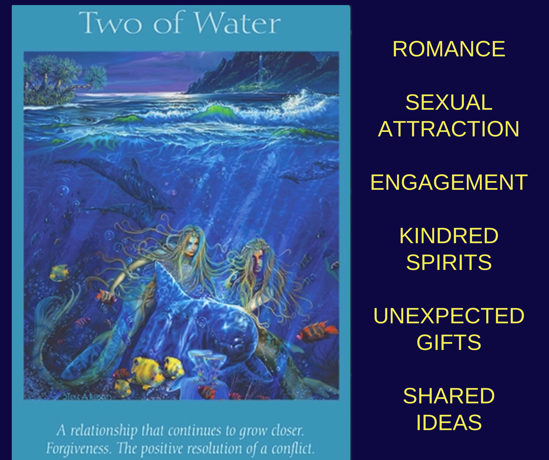 Additional meanings of this card: Romance. Sexual attraction. Engagement. Kindred spirits. An unexpected gift. Shared ideas.